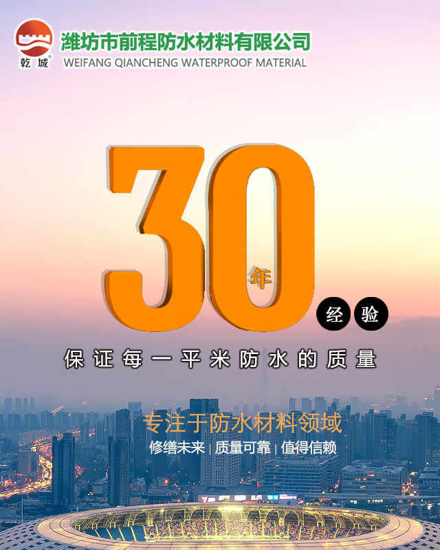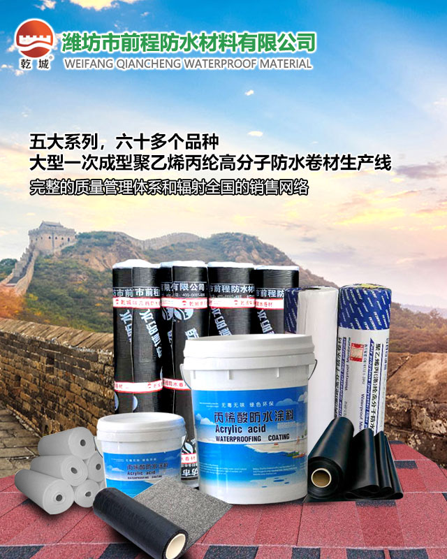 潍坊市前程防水材料有限公司坐落于中国防水之乡台头工业园区,依托强大的资源背景,公司稳健发展,是集科研、生产、销售和设计、施工于一体的实力较强的防水材料生产企业之一。公司引进全套先进设备,具有雄厚的技术力量,严格的检测系统;完全保证每一平米防水的质量。